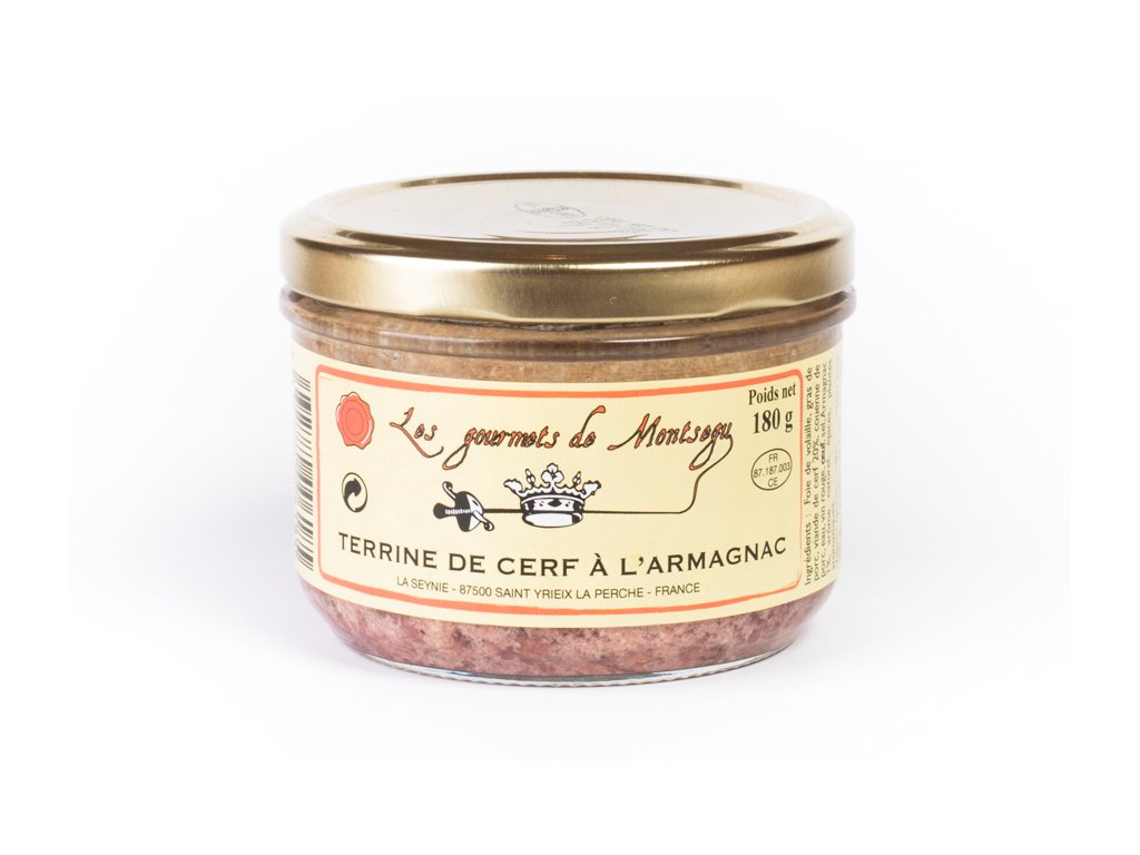 Složení: jelení maso 20 %, drůbeží játra, vepřové maso a tuk, armaňak 2 %, vejce, sůl, pepř, koření