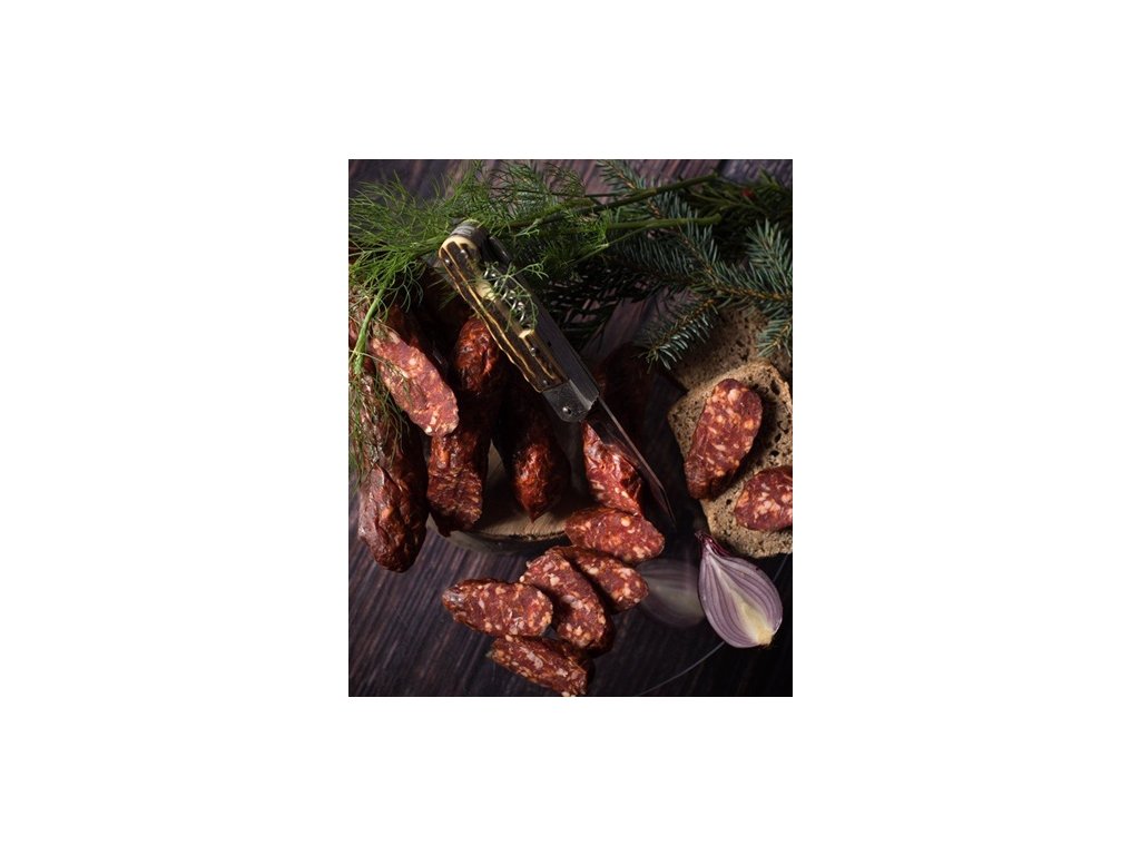 Složení: 65 % jelení maso, 23 % vepřové maso, 10 % hovězí maso, jedlá sůl, česnek, sladká paprika, pálivá paprika, pepř, drcený kmín, zázvor, cukr