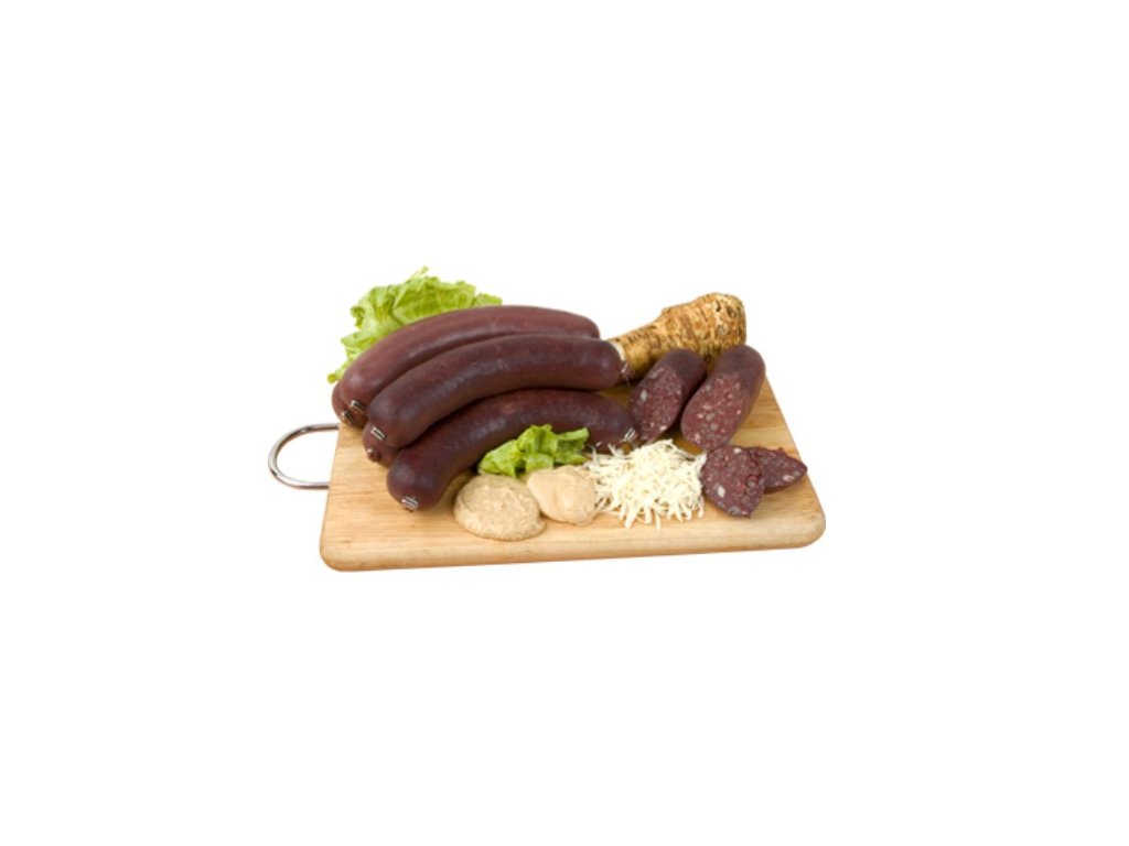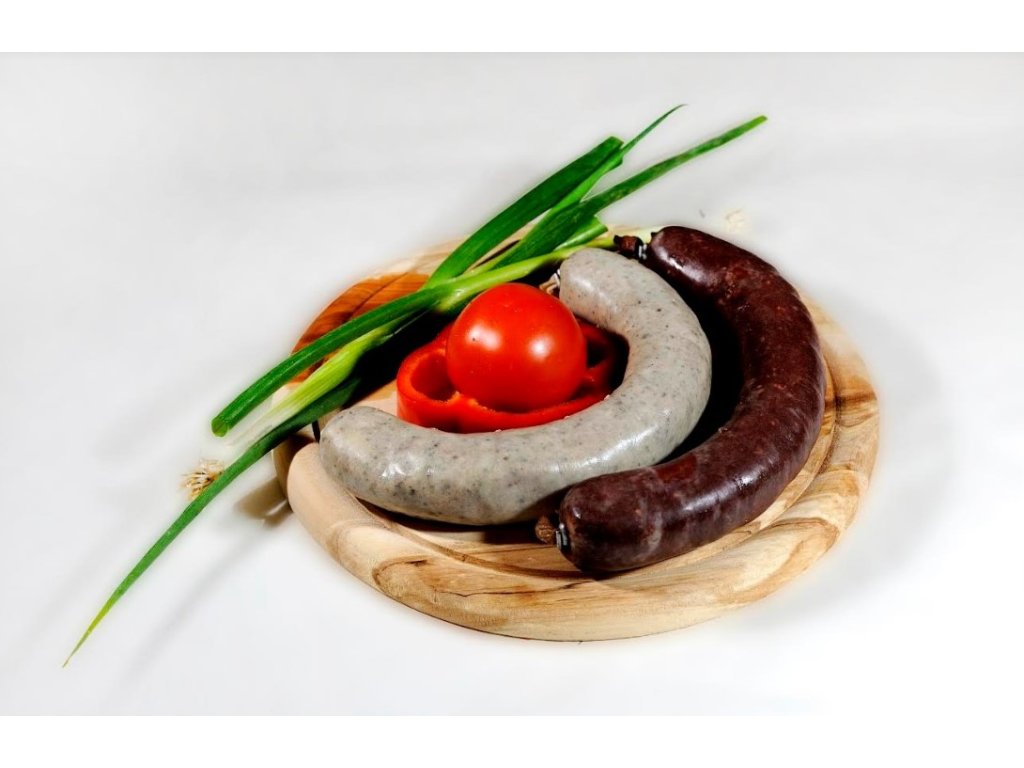 Další informace: Alergen: lepek. Bez laktózy. Tuk maximálně 60 %. Obsah masa 66 %. Masný výrobek tepelně opracovanýý. Jedlé střívko. Hmotnost cca 400 g, 2 kusy v balení.